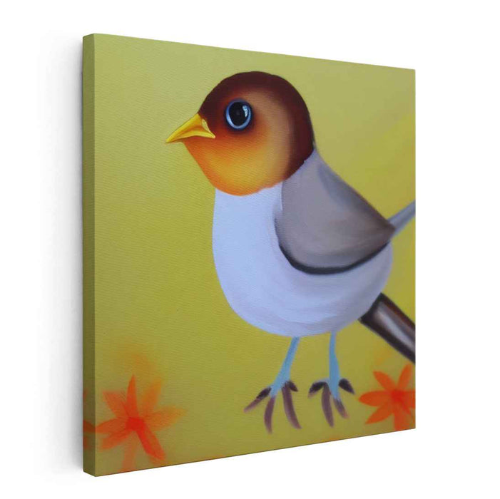 Introducing 'Citrus Sunshine Glow: Playful Yellow and Orange Canvas Art Print,' a delightful piece that captures the charm and innocence of a small bird in a vibrant and whimsical style, sure to captivate viewers of all ages. The artwork features a round-bodied bird with large, expressive eyes set against a bright yellow background, exuding warmth and cheerfulness.