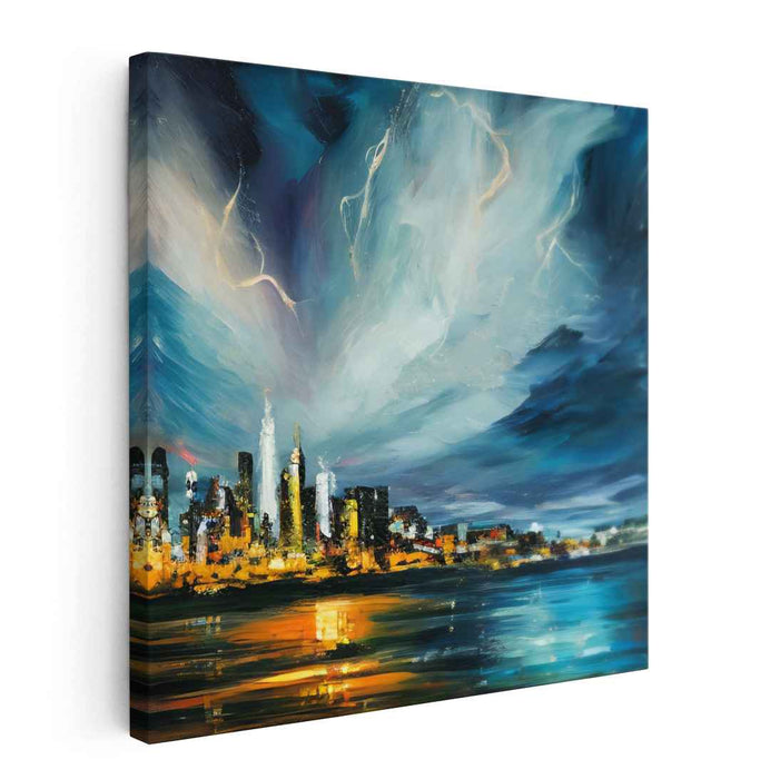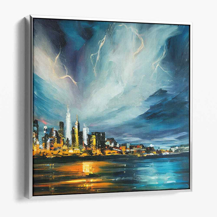 This artwork exudes a feeling of wonder and excitement, capturing the essence of a vibrant urban night with its dramatic skyline and electrifying atmosphere. Perfect for a modern living room or office space, 'City Lights Dance in Silence' serves as a captivating focal point that sparks conversation and infuses the room with a sense of dynamism and energy.