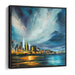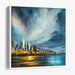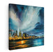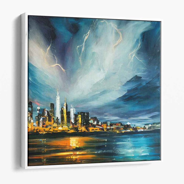 Introducing 'City Lights Dance in Silence: A Nighttime Urban Symphony on Canvas,' a mesmerizing cityscape canvas art that immerses viewers in a vibrant urban scene under a dramatic night sky. The artwork showcases a bustling city skyline aglow with vibrant lights, casting a mesmerizing reflection on the water's surface, creating a visually striking effect that captivates the eye.