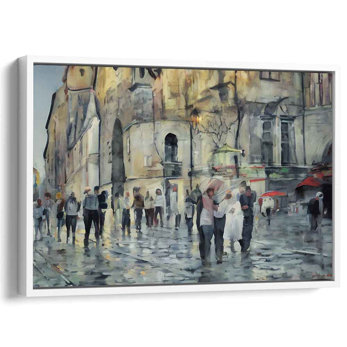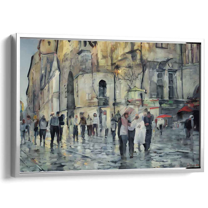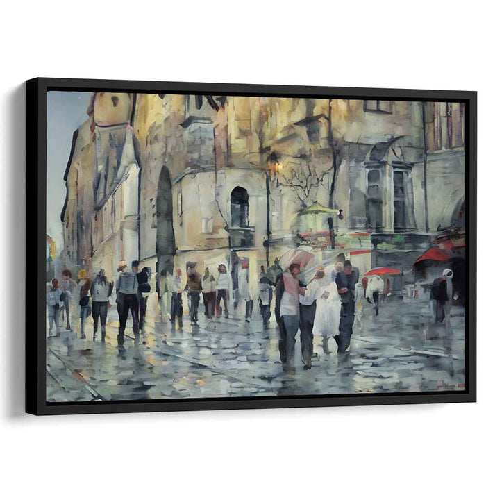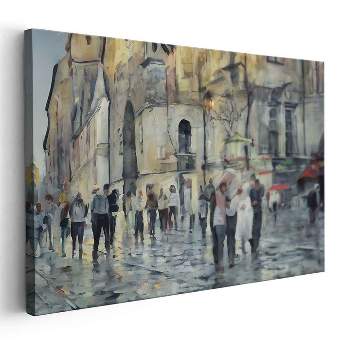 Immerse yourself in the enchanting world of 'Cityscape Chroma Drift: Urban Watercolor Streetscape,' a mesmerizing canvas art print that captures the essence of a bustling city under a rainy sky. This artwork skillfully portrays the play of light and shadow on the rain-kissed streets, where pedestrians adorned with a kaleidoscope of umbrellas traverse through the historic urban landscape.