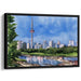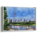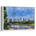 Introducing "Cityscape Grace," a mesmerizing cityscape canvas art that encapsulates the bustling energy of urban life harmoniously intertwined with the tranquility of nature. This captivating artwork showcases a vibrant city skyline dominated by an iconic tower reaching into the clear blue sky, surrounded by lush greenery and serene waters in the foreground.