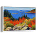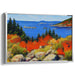 Step into the mesmerizing world of 'Coastal Splendor Canvas Art: Coastal Splendor Canvas Art,' a captivating masterpiece that transports you to a serene coastal haven where the vibrant colors of autumn dance harmoniously with the tranquil blues of the sea. This breathtaking landscape painting is a celebration of nature's beauty, where fiery red-orange foliage boldly contrasts with deep green evergreen trees, creating a visually striking composition that commands attention.