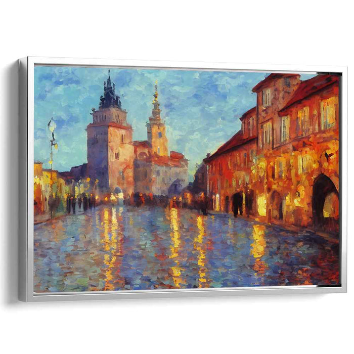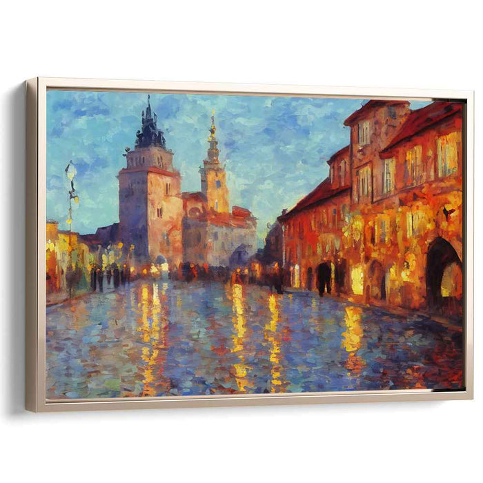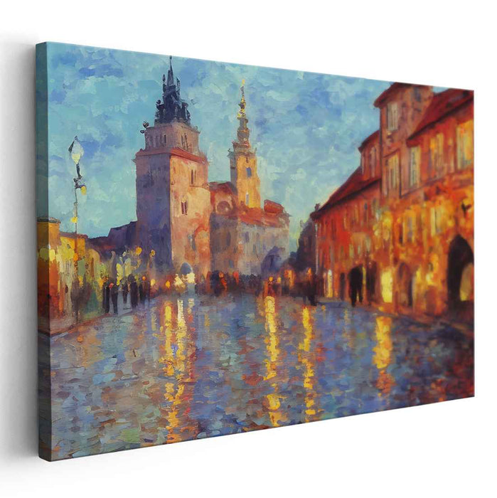 Step into the enchanting world of "Cobbled Streets Echo," a mesmerizing cityscape canvas art that whisks you away to a picturesque European town square basking in the warm embrace of twilight. This captivating artwork immerses you in the romantic ambiance of a historic city scene, where cobblestone streets glisten under the radiant glow of surrounding buildings, creating a scene straight out of a fairytale.