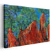 Step into the mesmerizing world of 'Color Symphony Nature Dream: A Vivid Impressionist Landscape Canvas Art,' a striking masterpiece that transports you to a realm of fiery red mountain peaks and lush greenery, all under a tranquil blue sky. This artwork is a symphony of colors, with deep crimson and burnt orange hues dominating the canvas, harmoniously intertwined with shades of green and hints of blue.