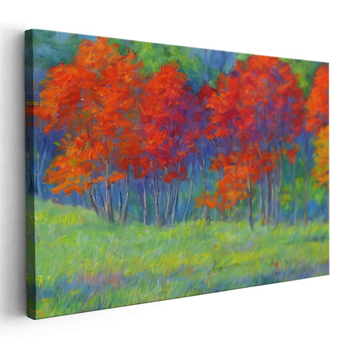 Introducing 'Colorburst Woods: Vibrant Forestscape in Oil,' a captivating canvas art print that vividly portrays the fiery beauty of autumn within a lush woodland setting. Immerse yourself in a scene where a cluster of trees adorned with vibrant red foliage stands out against a misty backdrop of soothing blues and greens. The artist's dynamic and bold brushstrokes bring the trees to life, creating a visual symphony of colors where the reds command attention amidst the tranquil background.