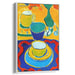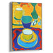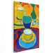 Introducing 'Colorful Dance of China,' a vivacious canvas art print that bursts with a symphony of colors and shapes, bringing a dynamic and lively still life composition to life. This captivating artwork features a vibrant display of cups and saucers, boldly painted in primary colors like brilliant yellows, deep blues, and vivid greens, creating a visually stunning and energizing experience.