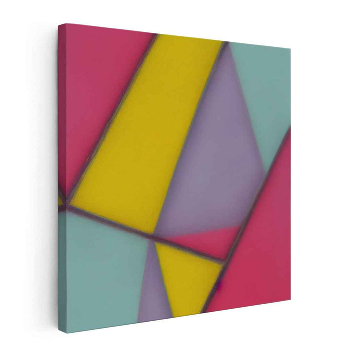 Introducing 'Colorful Geometric Kaleidoscope Dream: A Symphony of Color and Shape,' an electrifying abstract canvas art piece that mesmerizes with its vibrant exploration of form and color, igniting a visual symphony that captivates the senses. This artwork showcases a mesmerizing array of overlapping triangles, each a burst of life in vivid pink, deep yellow, and soft lavender hues, harmoniously set against a tranquil teal backdrop.