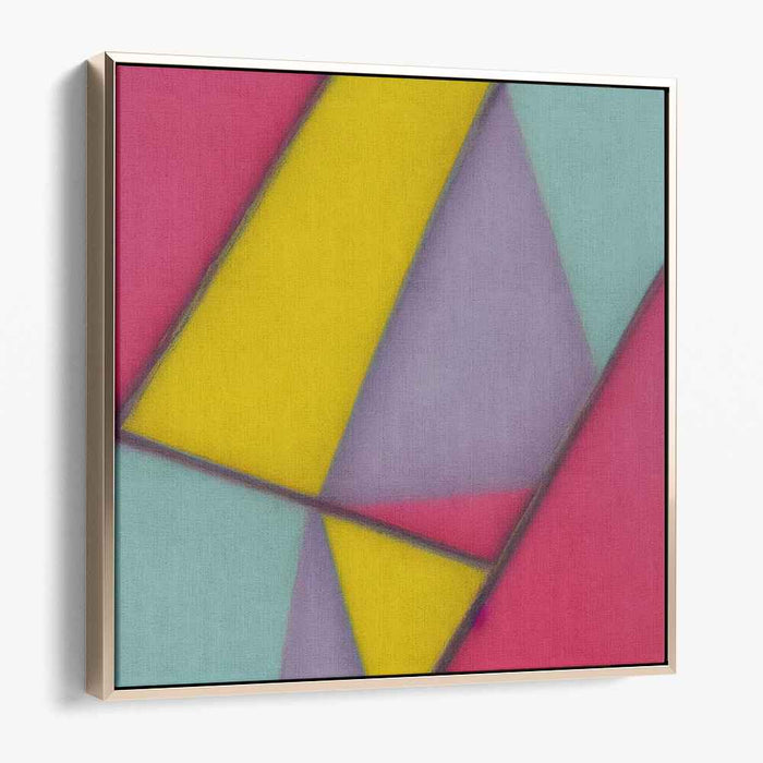 The sharp, precise lines of the triangles engage in a captivating dialogue with the soft, airbrushed textures of the colors, creating a dynamic interplay that infuses the piece with energy and movement. The artist's masterful use of a blurred effect at the edges of each shape imparts a dreamlike quality, almost as if the geometric forms are gracefully in motion, breathing life into the static composition.