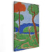 Introducing 'Colorful Jungle Adventure,' a captivating canvas art print that transports viewers to a tranquil lakeside oasis, brimming with vibrant colors and a sense of serenity. This refreshing artwork showcases towering trees with whimsically twisted trunks and lush, rounded canopies in various shades of green, framing a deep blue lake that exudes tranquility.