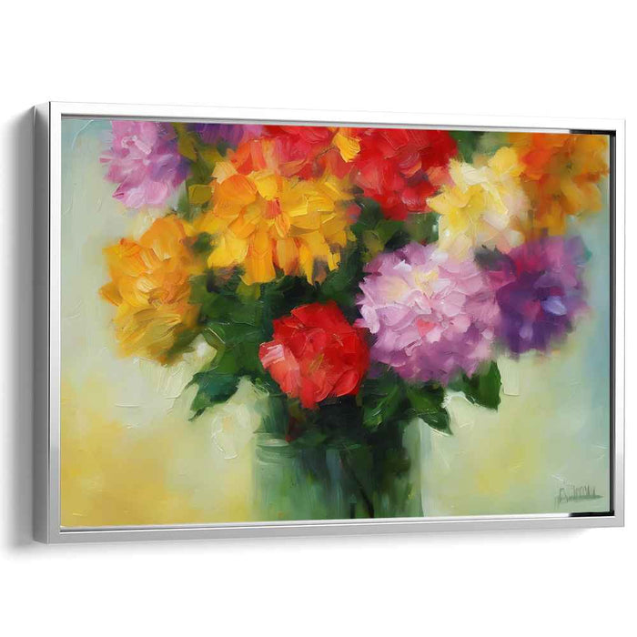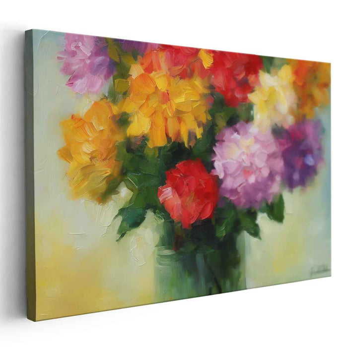 Introducing 'Colorful Symphony Impressions: Impressionist Symphony in Color,' a mesmerizing floral canvas art that brings a vibrant bouquet of flowers to life, each petal meticulously painted with a palpable texture. This stunning piece is a harmonious explosion of colors, ranging from deep reds and sunny yellows to delicate pinks and fiery oranges, set against a soft, creamy backdrop that enhances the dramatic vibrancy of the blooms.