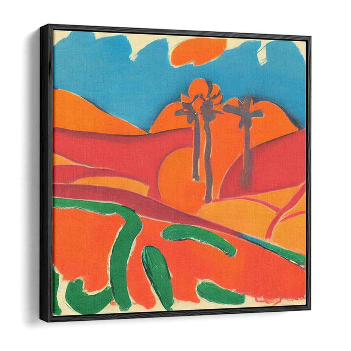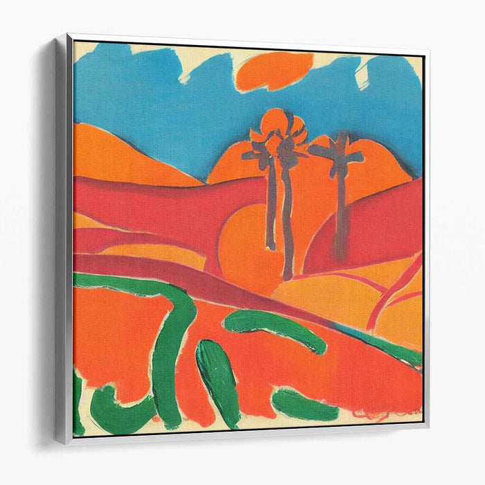 Witness undulating dunes painted in a fiery orange hue that dances against a backdrop of cool blue skies, creating a visual feast for the senses. Silhouettes of palm trees and a lone cactus ground the composition, juxtaposing the soft, flowing curves of the sand with their sharp outlines. The abstract shapes and seamless color transitions infuse the scene with a dream-like essence, encouraging each observer to decipher its enigmatic narrative through their own perspectives.