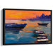 The foreground of the painting showcases several boats gracefully adrift on the calm waters, their silhouettes elegantly outlined against the colorful backdrop. The water mirrors the sky's fiery hues, with hints of blue and white dancing in the gentle ripples, creating a mesmerizing interplay of light and color.