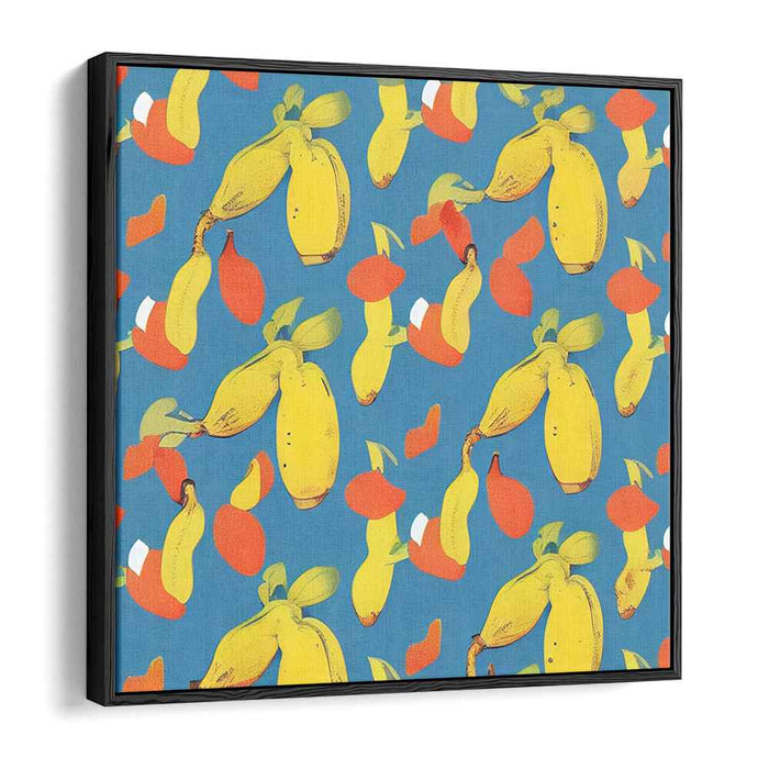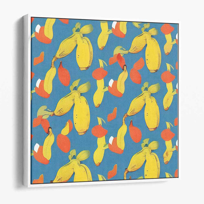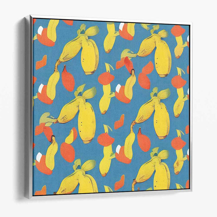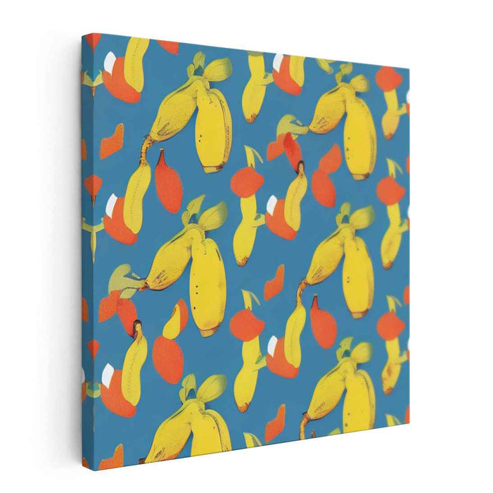 Introducing "Comic Chroma Canvas Splash: Pop Art Inspired Vibrant Canvas Print," a lively and dynamic artwork that brings a burst of joy and color to any space. This vivid piece features a delightful array of bananas and abstract shapes dancing across a bright blue background, creating a playful and whimsical composition.