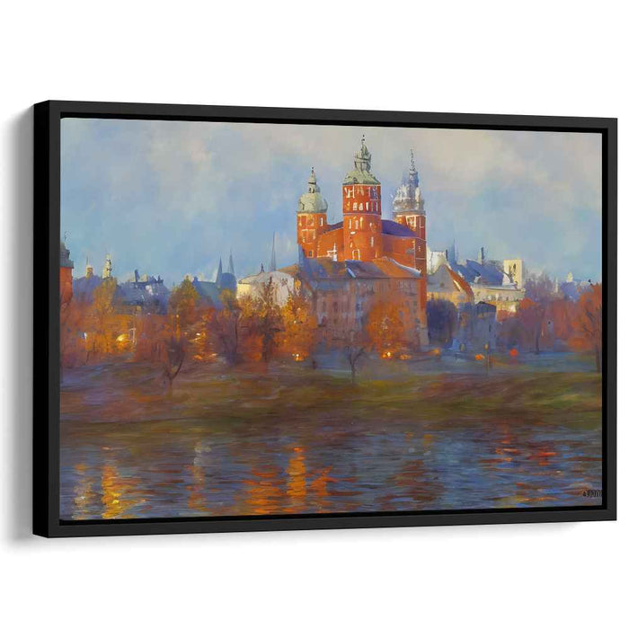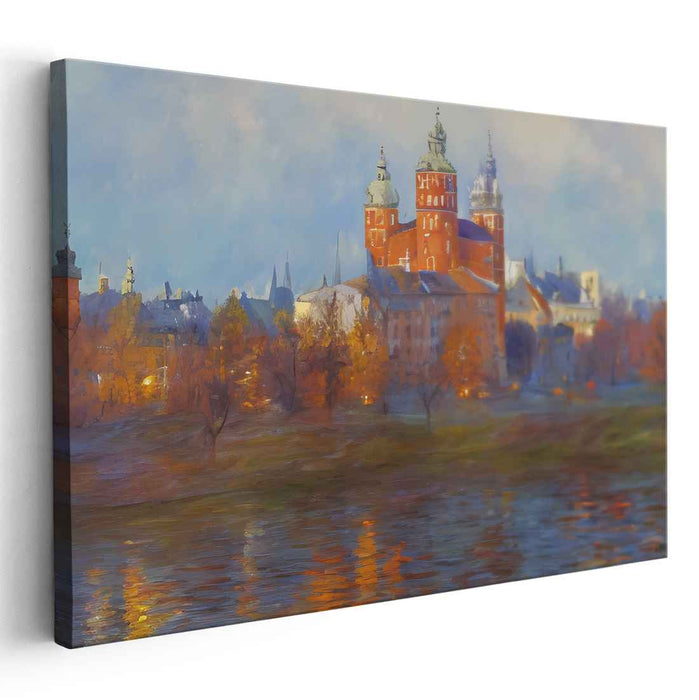 Introducing "Copper Steeples Splendor," a mesmerizing canvas art piece that transports viewers to a historic European cityscape enveloped in the serene beauty of autumn. This captivating artwork captures a picturesque scene dominated by a grand cathedral, its intricate architectural details standing boldly against a backdrop of soft, pastel-colored skies.