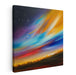 Introducing "Cosmic Horizon Exploration: Abstract Sunset Skyscape Canvas Art Print," a mesmerizing piece that harmoniously blends realism with abstract expressionism, capturing a breathtaking sunset over a tranquil landscape. The canvas is dominated by a vibrant sky, transitioning from warm tones of orange, yellow, and red to cooler shades of blue and purple, creating a captivating celestial display.