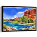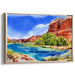 The artwork's primary colors feature deep blues mirroring the sky and river, harmoniously juxtaposed with the warm, earthy reds and oranges dominating the monumental rock formations. Complementing these are secondary hues of lush greens along the riverbank and delicate touches of yellow and purple in the foreground flora, creating a rich and immersive visual experience.