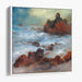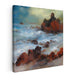 The swirling sky above, painted in stormy blues and greens, enhances the sense of movement and intensity within the scene. The artist's dynamic brushwork technique infuses the water and rocks with a textured, almost tactile quality, inviting viewers to feel the energy of the ocean and the solidity of the rocks.
