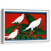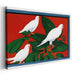 Introducing 'Crimson Flight,' a captivating canvas art print featuring a trio of pristine white doves elegantly perched on lush green foliage against a bold red backdrop. The simplicity and grace of the doves stand out against the vibrant, attention-commanding red, creating a visually striking contrast.