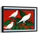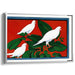 The deep red background sets a dramatic tone, while the lush green leaves and pure white doves create a harmonious balance that is both soothing and visually arresting. The composition's primary color, the bold red, adds vibrancy and depth, enhancing the overall impact of the piece.