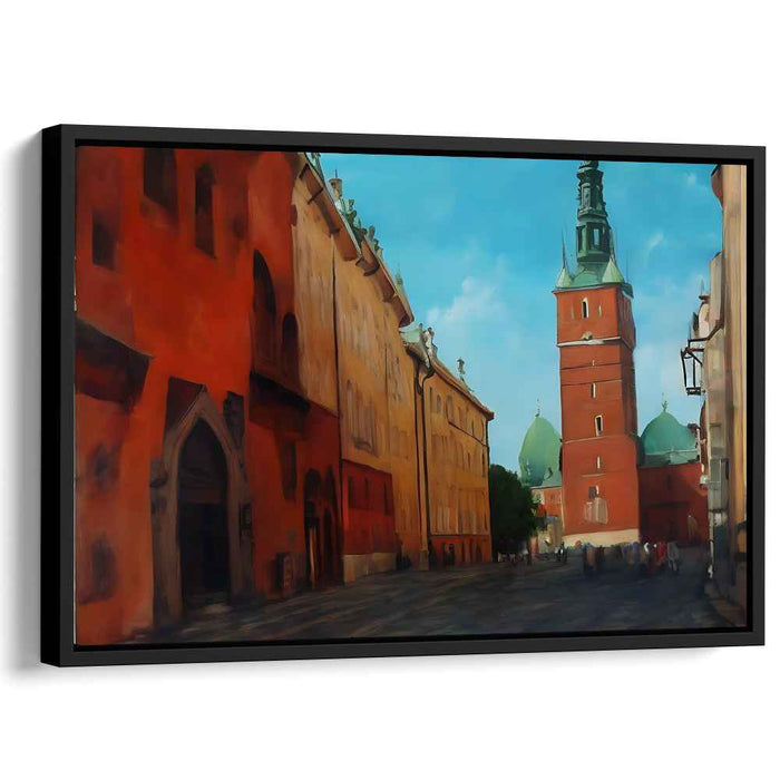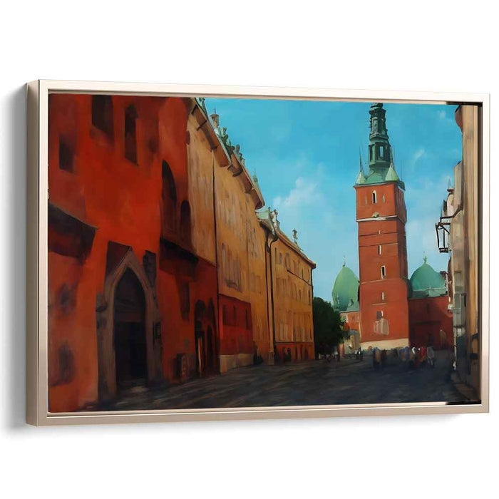 Step into the enchanting world of the "Crimson Glow Architectural Impression: Sunlit Red-Brick Tower" canvas art print, a mesmerizing depiction of a charming European city bathed in the golden glow of a sunny day. This captivating artwork draws viewers into a picturesque scene dominated by a majestic red-brick tower crowned with a verdant spire, standing proudly against a backdrop of a clear, azure sky.