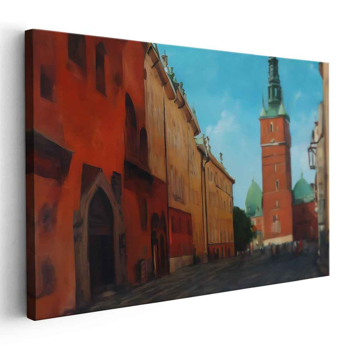 The artist skillfully captures the essence of the cityscape with a blend of realism and impressionism, infusing the scene with a sense of vibrancy and movement. Detailed historic buildings, adorned with intricate architectural features, line the cobblestone street, their warm earthy hues contrasting harmoniously with the cool, expansive sky above. The primary color palette of rich, warm reds is complemented by accents of lush green, calming blue, and subtle beige tones, creating a visual tapestry that is both inviting and captivating.