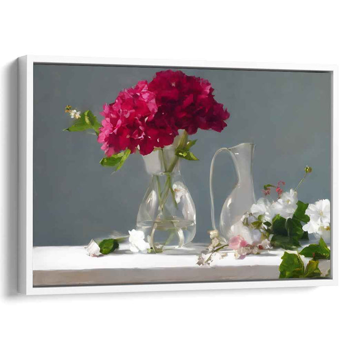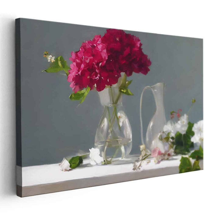 The centerpiece of this artwork is the striking bouquet of red hydrangeas, exuding elegance and grace. The meticulous composition includes a transparent glass vase and a slender glass pitcher, both delicately holding water, adding a touch of transparency and lightness to the scene. Complementing the hydrangeas are small white flowers that bring purity and simplicity to the overall arrangement.