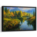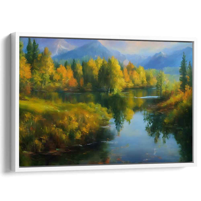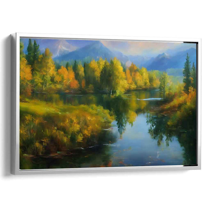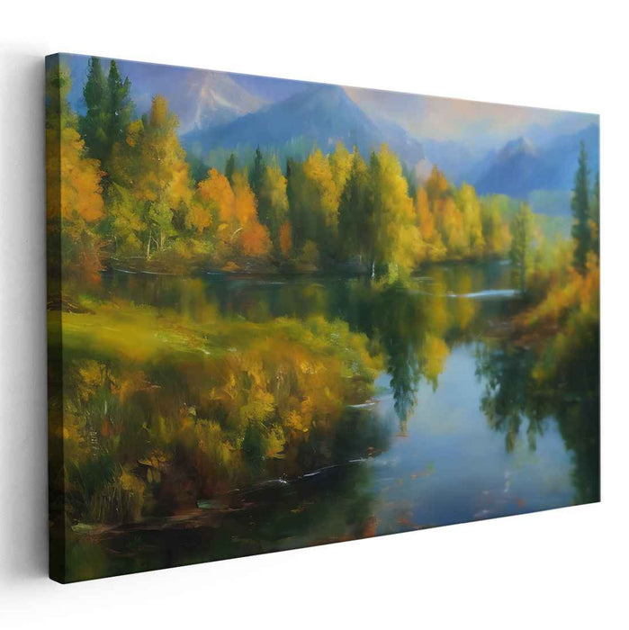 Introducing 'Crisp Reflections: Autumn Lake and Mountain Landscape,' a mesmerizing canvas art print that transports you to a tranquil oasis nestled in a lush forest, where a serene lake mirrors the rich colors of autumn foliage under the watchful gaze of majestic mountains. This breathtaking artwork captures the essence of nature's beauty in a harmonious blend of greens, yellows, and oranges, reflecting on the peaceful waters like a mirrored canvas.