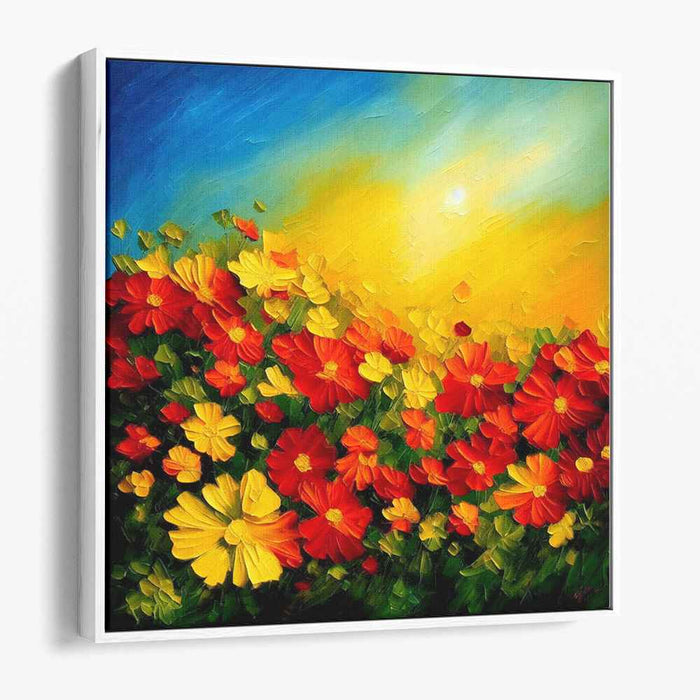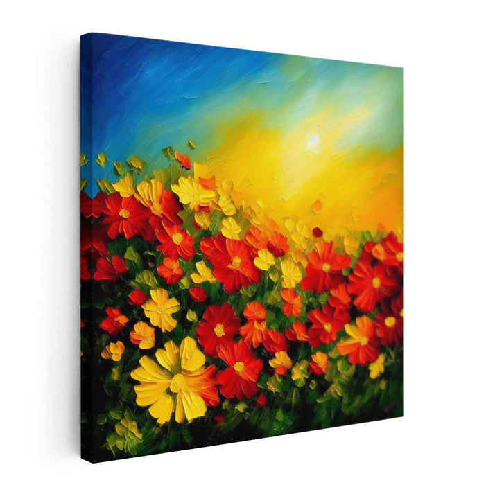 Introducing "Daisy Daydreams: Sunlit Field of Flowers," a captivating canvas art print that transports viewers into a vibrant field of flowers, basking under the warm embrace of the radiant sun. This vivid and expressive artwork is a masterful portrayal that immediately captivates with its dynamic use of color and texture, inviting viewers into a scene brimming with life and energy.