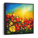 The primary colors in this piece are a brilliant blue sky and a golden yellow sun, casting a warm, luminous light over the entire scene. Bold reds, oranges, and yellows adorn the flowers, creating a striking contrast against the lush green foliage that dances with life. The artist's technique of thick, impasto brushstrokes adds a three-dimensional quality to the painting, making the flowers almost palpable, as if they could be plucked from the canvas.