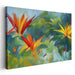The canvas explodes with a riot of colors dominated by vibrant oranges and yellows emanating from the fiery bird of paradise flowers, set against a backdrop of soft, blurred greens and blues that create a harmonious contrast, drawing the viewer into a tropical paradise of unparalleled beauty. The artist's skill is evident in the composition, striking a delicate balance between spontaneity and precision, capturing the essence of nature's exuberance.