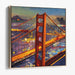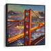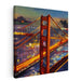Introducing 'Dappled Bridge Shadows,' a mesmerizing canvas art piece that captures the enchanting beauty of an iconic suspension bridge at twilight, reminiscent of the majestic Golden Gate Bridge. The artwork showcases a dynamic interplay of vibrant hues that illuminate the scene, with the bridge's radiant orange-red structure commanding attention against a twilight sky.