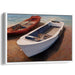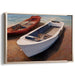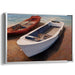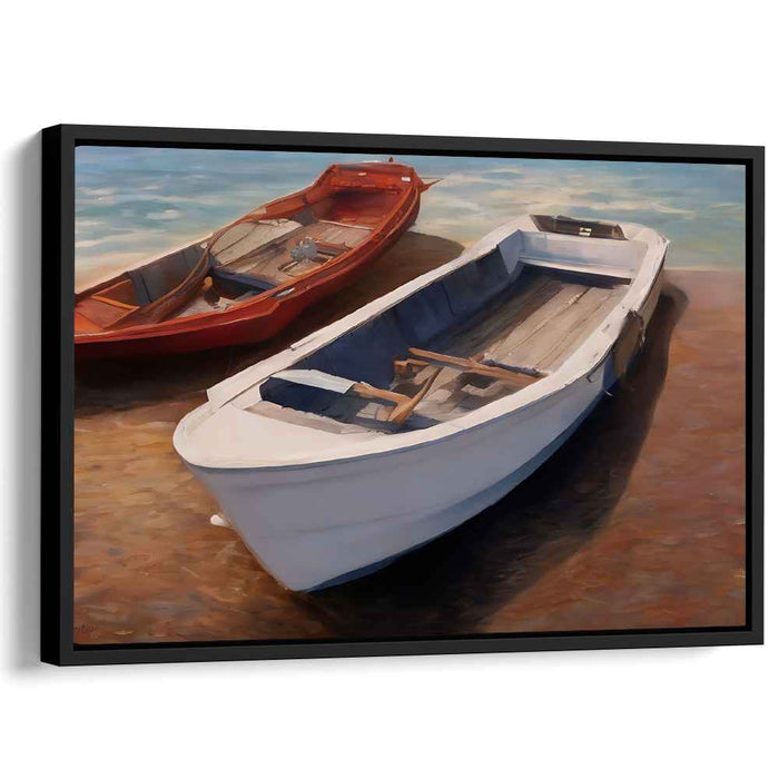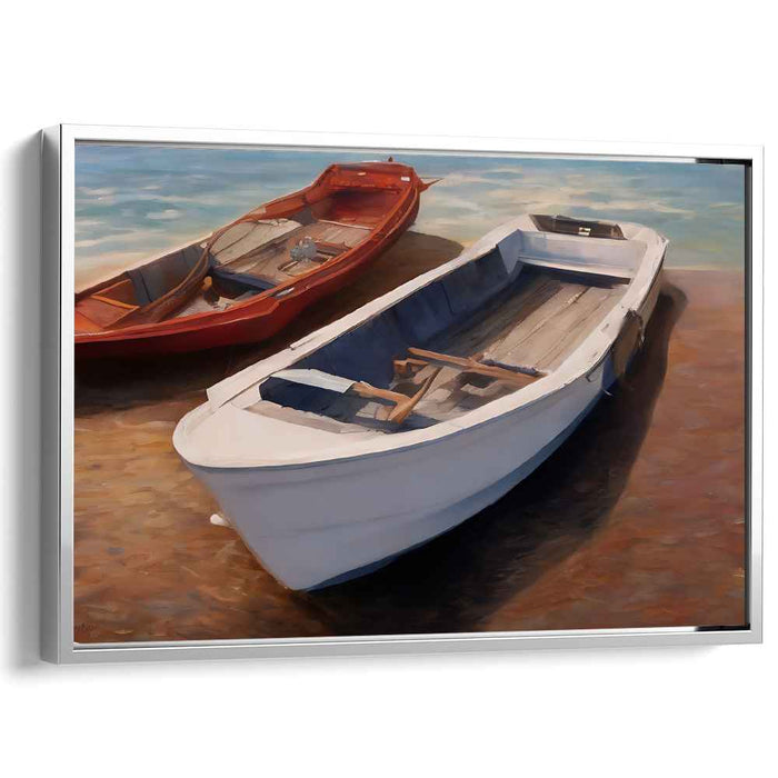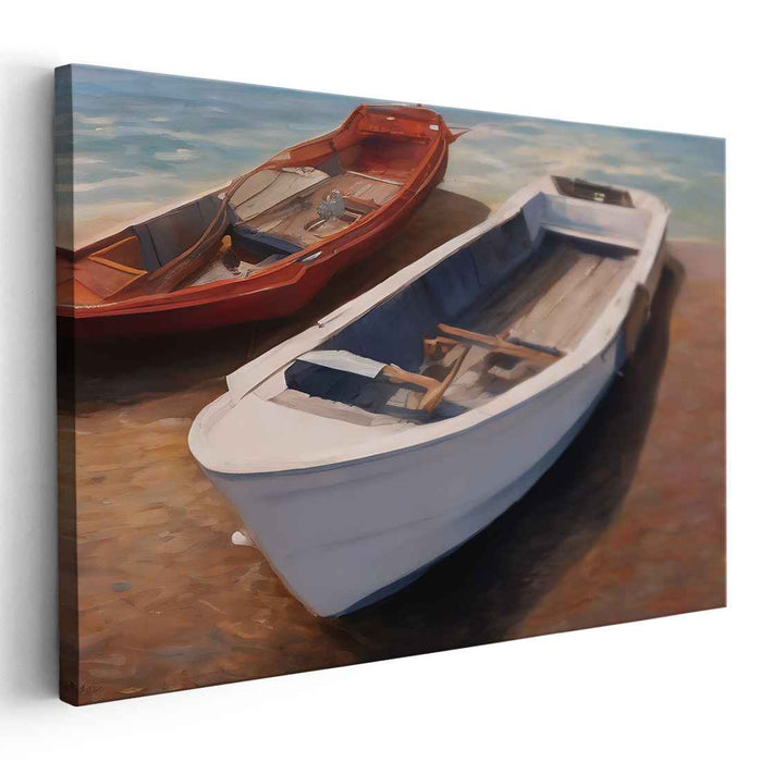 Introducing 'Daybreak Marina Reflections: Realistic Boats in Sunlit Serenity,' a mesmerizing canvas art print that transports you to a serene coastal setting where two boats peacefully rest on a sunlit shore. The scene captures a white boat in the foreground, meticulously detailed with clean lines and subtle shadows that play in the sunlight. Contrasting beautifully, a red boat adds a vibrant touch, creating a harmonious and visually striking balance between the two vessels.