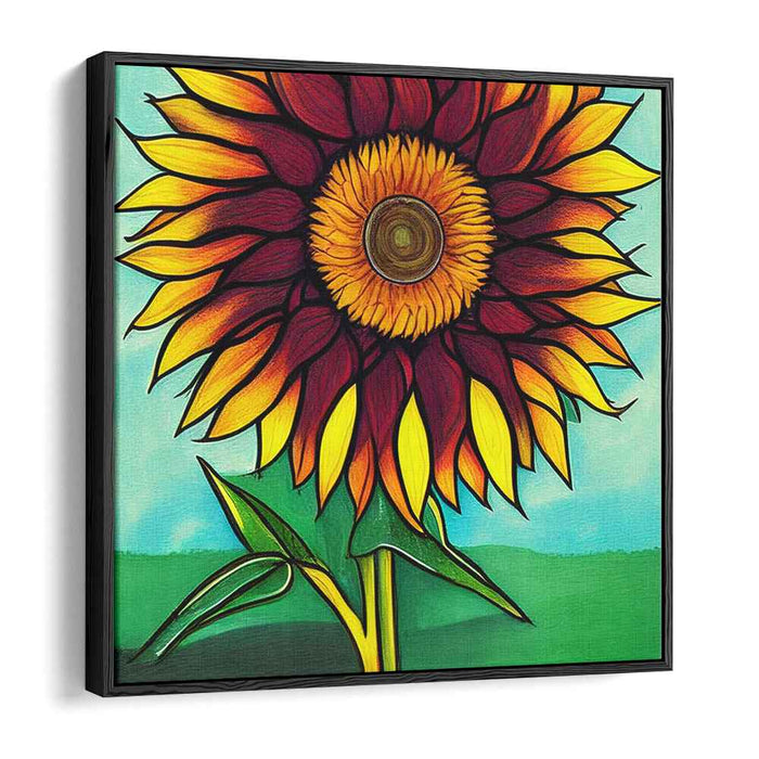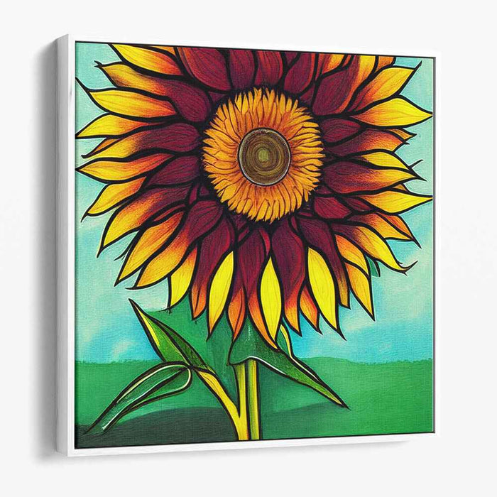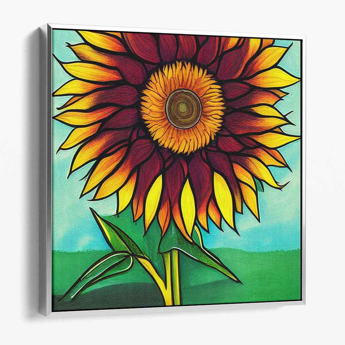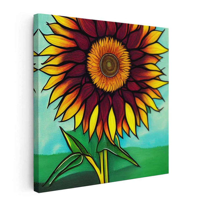 Introducing 'Dazzling Sunflower Splendor,' a captivating and vibrant sunflower canvas art print that commands attention with its bold and dynamic style. The artwork features a richly detailed sunflower, bursting forth with a fiery blend of reds, oranges, and yellows, set against a gradient background transitioning from serene sky blue to lush green.