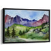 The painting's focal point is the jagged peaks of the mountains, skillfully depicted in deep shades of purple and crimson, creating a striking contrast against the lush greenery of the forest below. The artist's masterful use of the wet-on-wet technique allows colors to blend seamlessly, imparting a soft and ethereal quality to the scene.