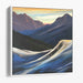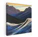 Introducing 'Dusk's Calm Palette,' a captivating canvas art print that transports viewers to a tranquil mountainous landscape at sunset, capturing the majestic beauty of towering peaks and winding rivers under the soft evening glow. This breathtaking artwork showcases a series of grand mountains extending into the distance, their summits bathed in the warm hues of a setting sun, creating a scene of awe-inspiring beauty and serenity.