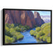 Introducing 'Earth's Vast Crevice,' a mesmerizing landscape canvas art that transports viewers to a tranquil river meandering through a majestic canyon, encapsulating a sense of serene beauty and natural splendor. This captivating artwork features a peaceful river, glistening under the light, winding its way through lush greenery, embraced by towering, rugged cliffs.