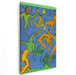The canvas is dominated by a deep, rich blue that serves as a dramatic backdrop for the lively figures depicted in bright greens, bold oranges, and striking yellows. These colors collide and harmonize, creating a visual symphony of movement and emotion. The figures, outlined in thick, expressive black lines, exude a sense of vitality and freedom, reminiscent of Henri Matisse's iconic cut-outs.