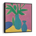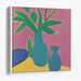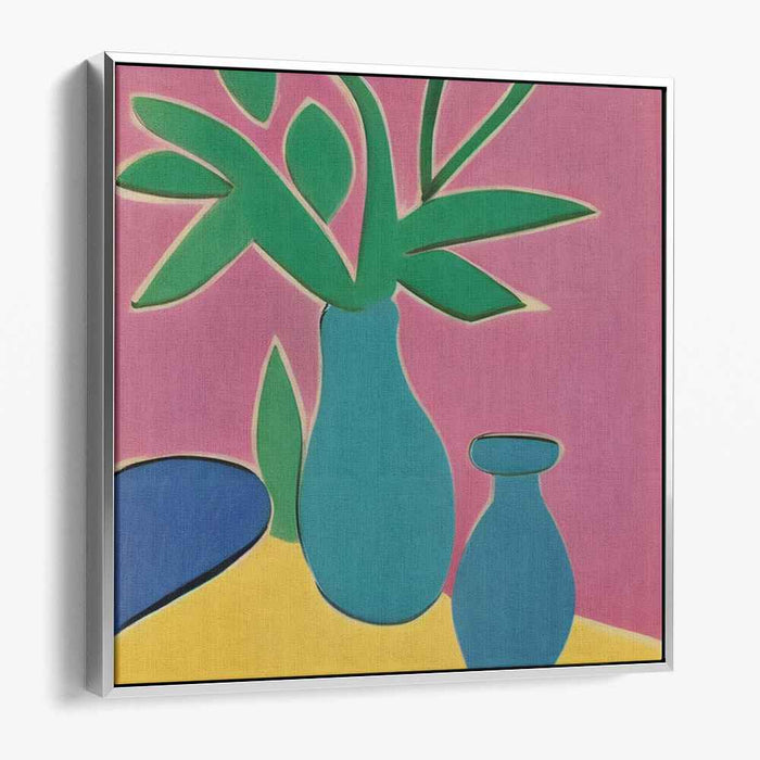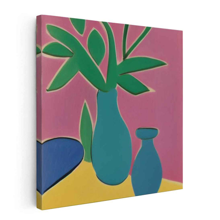 Step into the world of Echoes of Sapphire Serenity: Modern Still Life with Blue Vase and Green Leaves, a captivating canvas art piece that exudes modern sophistication through its minimalist yet strikingly colorful composition. This artwork features a visually arresting blue vase as the focal point, adorned with vibrant green leaves that elegantly fan out, creating a dynamic and visually engaging arrangement. Placed against a backdrop of vibrant pink, the colors in this piece pop with a sharp contrast, drawing the viewer into a world of bold hues and simple forms.