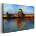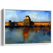 Introducing "Echoes Of Stone Whispers: Majestic Architectural Canvas Art Print," a breathtaking piece that captures the grandeur of an iconic architectural landmark mirrored in a tranquil body of water. This artwork focuses on a majestic building illuminated by a warm, golden light against the serene blues of the sky and water, creating a visually stunning contrast.