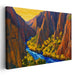 Step into the awe-inspiring beauty of 'Electric Echoes Over Stone,' a mesmerizing canvas art print that encapsulates the grandeur of a canyon at sunset. This artwork intricately portrays a deep canyon sculpted by a vibrant blue river, surrounded by towering cliffs aglow in the warm embrace of the setting sun.