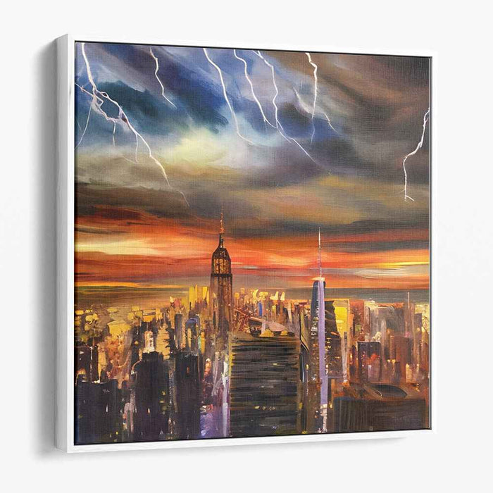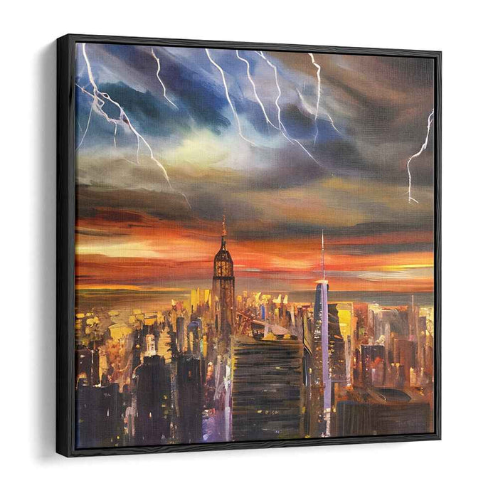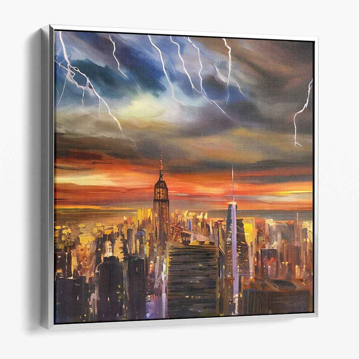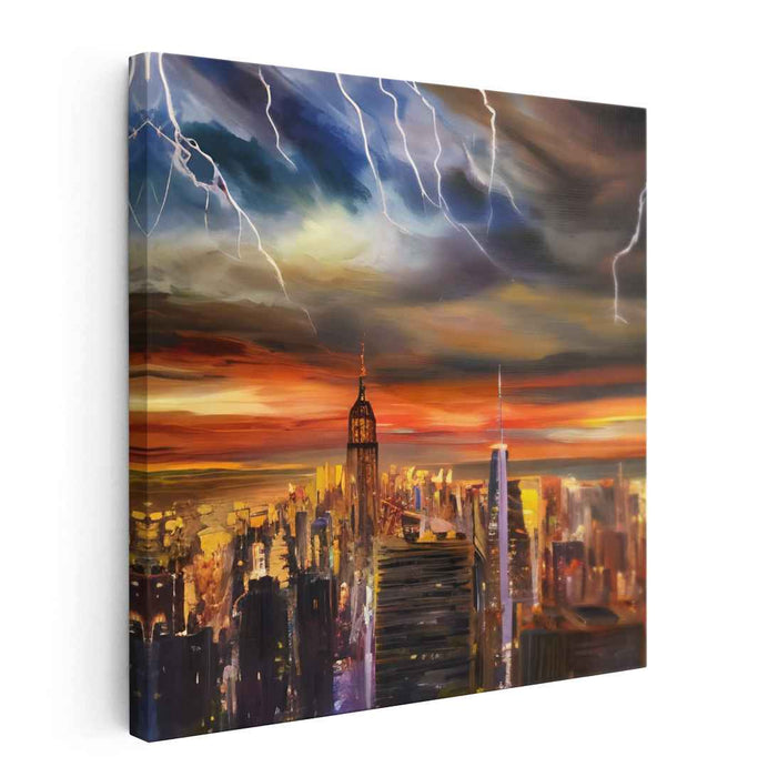 Experience the drama and intensity of urban life with a museum-quality canvas print of 'Electrifying Skyline.' Add this captivating artwork to your collection and immerse yourself in the electrifying beauty of a city under stormy skies.
