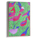 Introducing "Emerald Avian Symphony: Abstract Birds in Vibrant Green," a captivating canvas art that bursts with energy and color, depicting a modern and abstract interpretation of birds in a dynamic and lively composition. This artwork showcases a vibrant scene where multiple birds, in striking red, purple, and blue tones, take flight against a lush green backdrop, creating a visually stunning contrast.