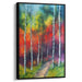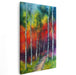 The primary color palette of this piece is dominated by the rich, vibrant reds of autumn, harmoniously complemented by secondary hues of green, yellow, and blue. These colors infuse depth and contrast into the composition, creating a visual feast for the eyes. The meticulous detailing of the birch trees, with their distinctive white and black striped bark, offers a striking contrast against the warm tones of the forest, adding a layer of visual intrigue.