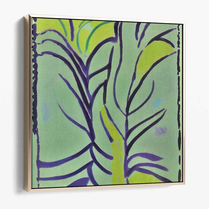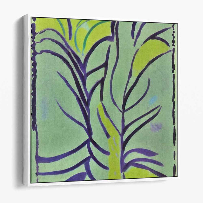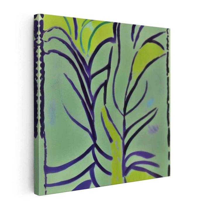 Step into the enchanting world of 'Enchanted Blooms in Midair: Abstract Botanical Dream,' a mesmerizing canvas art that offers a fresh, abstract take on the beauty of nature. This captivating artwork draws viewers into a realm of fluid, organic lines and shapes that hint at botanical elements like leaves and plants, all portrayed in a vivid palette of deep purples, vibrant greens, and subtle blues and yellows.