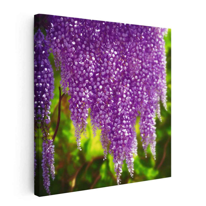 Set against a backdrop of blurred, verdant greenery, the vibrant purples of the wisteria flowers pop with striking contrast, drawing the eye into a world of natural beauty. The soft focus technique used in the background lends a dreamy, ethereal quality to the piece, enhancing the sense of depth and making the blossoms appear almost weightless, as if floating in a serene botanical dreamscape.