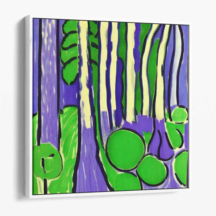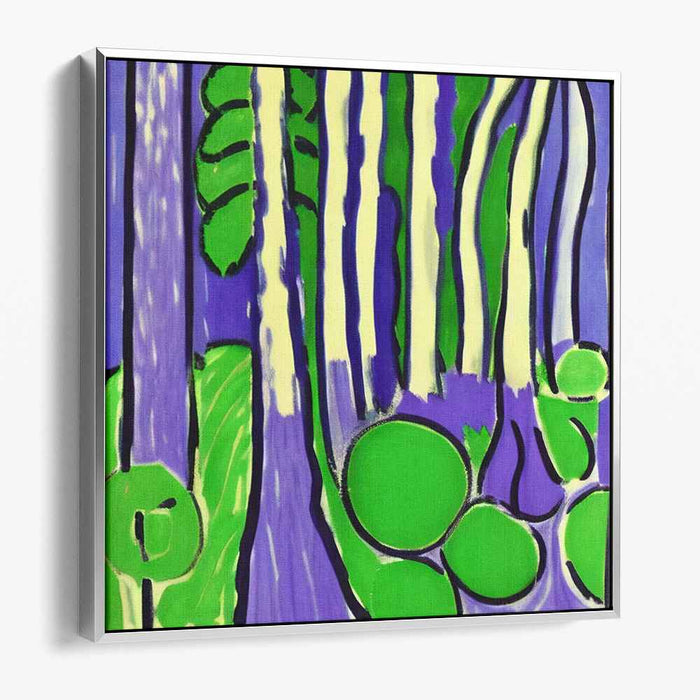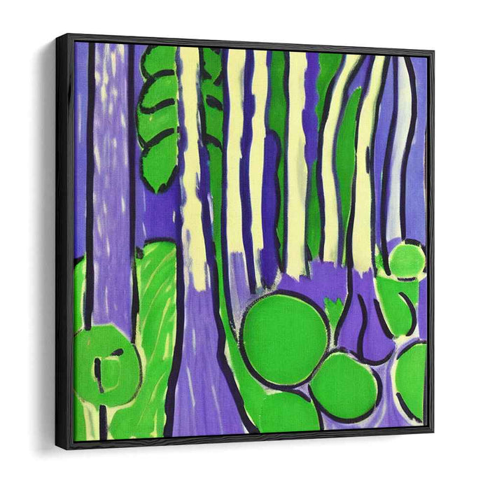 Reflecting a modern and graphic quality, this artwork draws inspiration from the works of Henri Matisse, particularly his famous cut-out technique. The use of flat, bold colors and clearly defined shapes pays homage to Matisse's style, adding a touch of sophistication and artistic flair to 'Enchanted Neon Woodland Oasis.'