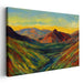Introducing "Eternal Serenity Valley: Mountain Valley Landscape Canvas Art Print," a mesmerizing painting that transports viewers to a tranquil mountain valley illuminated by the warm glow of a setting sun. The artwork captures rolling hills and towering peaks in a symphony of vibrant shades - oranges, reds, and greens - harmoniously blended to evoke a profound sense of tranquility and wonder.