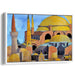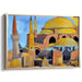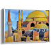 The primary color palette of warm ochres and golden yellows dominates the canvas, enveloping the domes and spires in a sense of timeless warmth. Complemented by cool blues and greys representing the sky and shadows, the artwork achieves a striking balance of hues that bring the Hagia Sophia to life with vivid realism.
