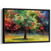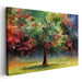 The focal point of this artwork is the magnificent tree, its sturdy trunk anchoring a canopy of leaves in shades of emerald green, fiery red, soft pink, and sunny yellow. The artist's use of color is dynamic and fluid, with the foliage depicted in a loose and expressive style that allows the colors to blend seamlessly, creating a dreamy and enchanting atmosphere.