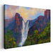 The focal point of this masterpiece is the breathtaking waterfall, cascading dramatically between imposing cliffs and surrounded by a lush, vibrant forest. The artist skillfully portrays the interplay of light and shadow, with the water thundering down amidst the verdant greenery, creating a mesmerizing visual symphony that captivates the eye.